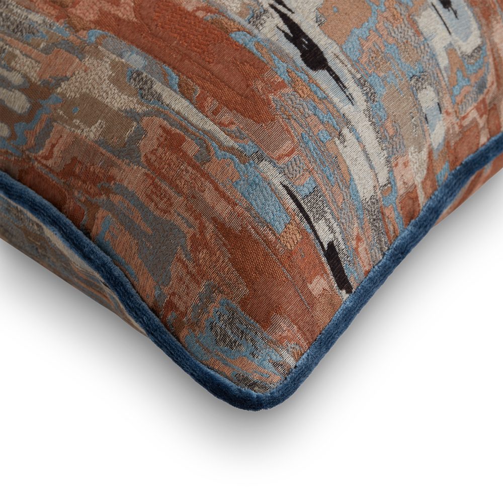 Cascade is a stunning silk, linen and viscose intricate jacquard cushion and crafted from the fabric by the same name. Featuring a complex natural form design and showcasing multi colours, this Cascade cushion has been finished with a piped detail in the glorious Silk Velvet Sapphire which highlights the multi blue tones within the fabric. Alternatively we welcome requests for a different coloured piped Silk Velvet such as Emerald, Rosewood and Spice. Handmade with true craftsmanship in the UK, Cascade is a perfect finishing touch on a sofa or bed and will elevate an interior with its effortless elegance. Bespoke sizes and finishes are welcomed.