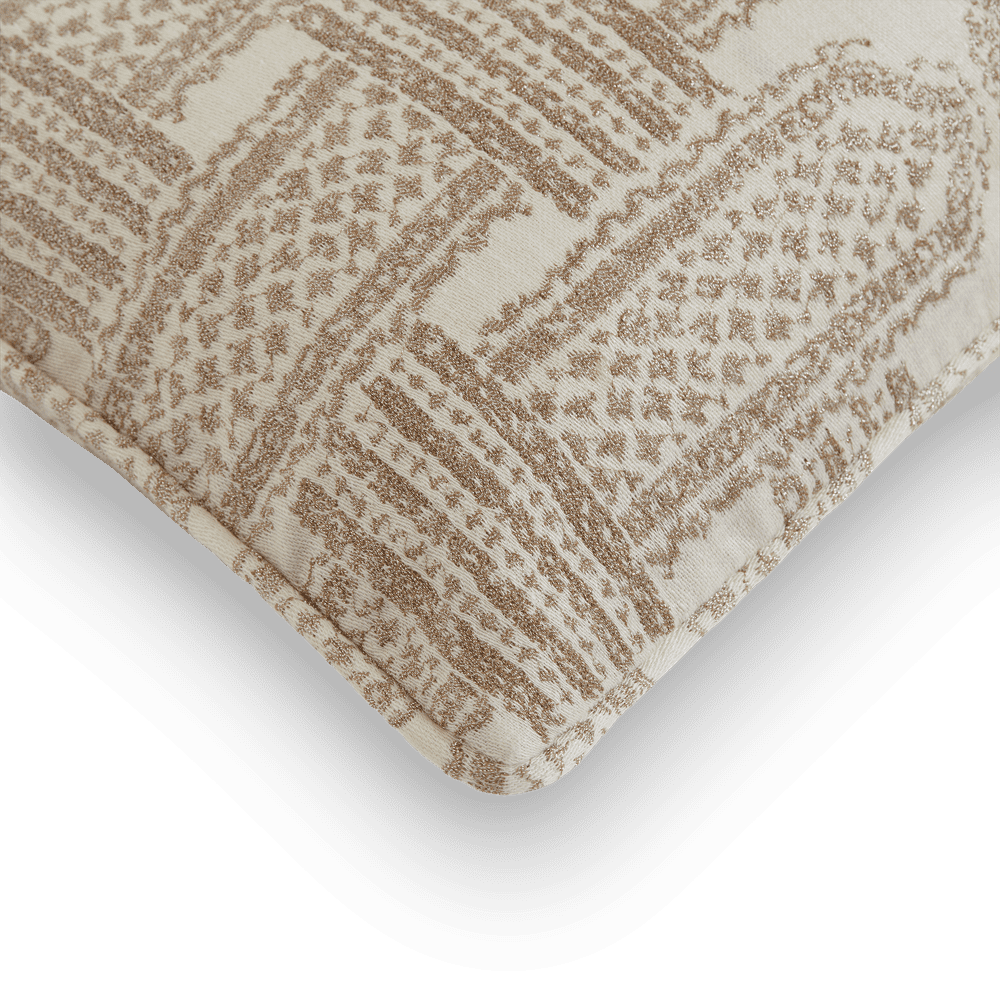 Frame cushions crafted from the Frame fabric features an interlocking tab design reminiscent of antique textiles and haberdashery. Frame cushions, finished wth a self piped detailed, are embroidered using a metallic yarn on a satin pure linen ground. Frame has a gentle intimate glamour with a light touch that creates the most fabulous cushions. Bespoke size requests are welcomed.
