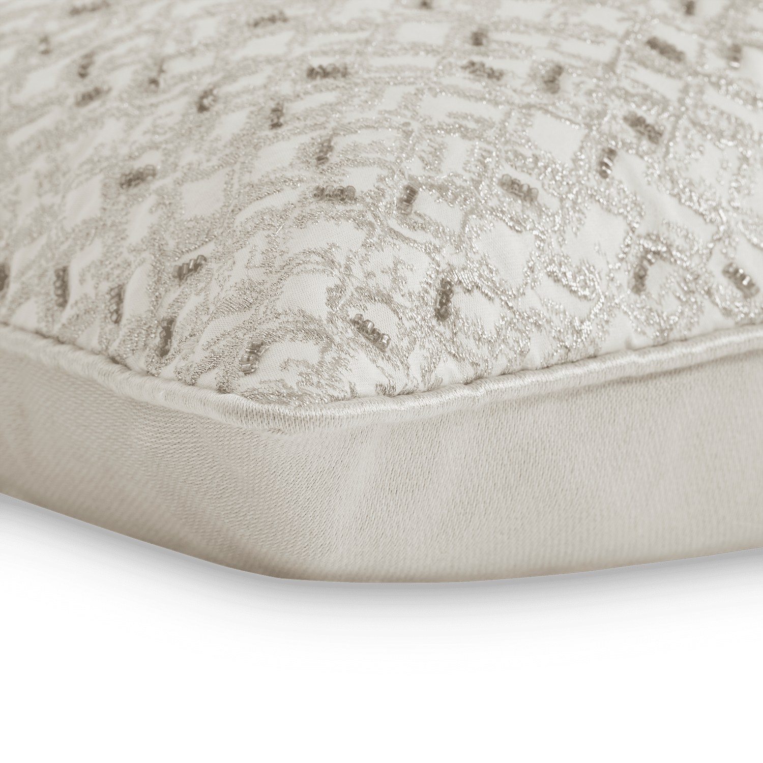 Front: SURFACE: 55% Metallic Thread, 45% Glass Beads. Ground 50% LI, 50% CO. Back and Piping: SE, LW