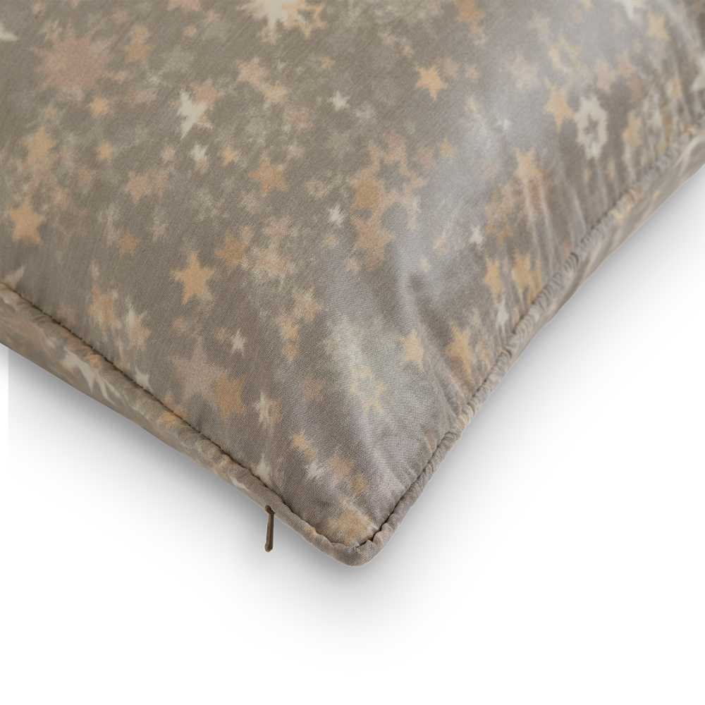 Star is a traditionally warp printed silk taffeta cushion. This is a truly ancient and artisanal process involving printing of the warp before the weft is woven; this gives the ethereal and slightly diffused quality to this refined starry design. Star Copper combines jades and burnt oranges; Star Gold works with warm taupes, creams and greys and Star Platinum seems to combine all the greys and neutrals of the moon and stars. Star is a wonderful decorative cushion choice for luxuriously layered schemes and works equally well as a style statement. Bespoke sizes and finishes are welcomed and Star cushions are truly magical finished with a metallic fringe.